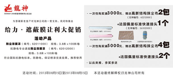 一次性購買滿5000元,贈送高新結(jié)構(gòu)抺塵布(龍神編號:62212000)4包+法國佩釜標準快速接頭(龍神編號:36102000)2個