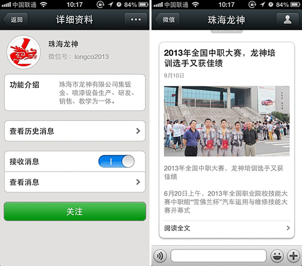 珠海龍神官方微信敬請(qǐng)關(guān)注! 珠海市龍神有限公司公共微信號(hào)已申請(qǐng)成功,請(qǐng)大家多多關(guān)注! 掃描二維碼,也可直接搜索公眾微信號(hào)“珠海龍神” 我們將不定期發(fā)布公司最新資訊。 您也可以發(fā)消息和我們進(jìn)行互動(dòng)。 查看歷史消息收看您錯(cuò)過的動(dòng)態(tài)新聞,讓您第一手掌握最新動(dòng)態(tài)。 2013-09-18 16419